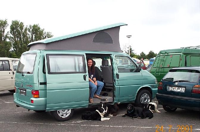 Im Sommer 2001 erfüllten wir uns einen ich-weiß-nicht-wie-lange-schon gehegten Traum und kauften uns das passende Auto zu unseren umtriebigen Hobbies: einen VW-Bus mit Faltdach und Campingausstattung. Endlich sind wir die Sorge los "was machen wir bloß, wenn wir den letzten Autozug auf die Insel verpassen" (natürlich haben wir seit dem Kauf dieses Autos den Zug noch kein einziges Mal verpaßt...). Auf Trials, Seminaren, an unserer Sommerpferdeweide und vielen anderen Veranstaltungen leistet uns dieses Gefährt jede Menge praktische Dienste.